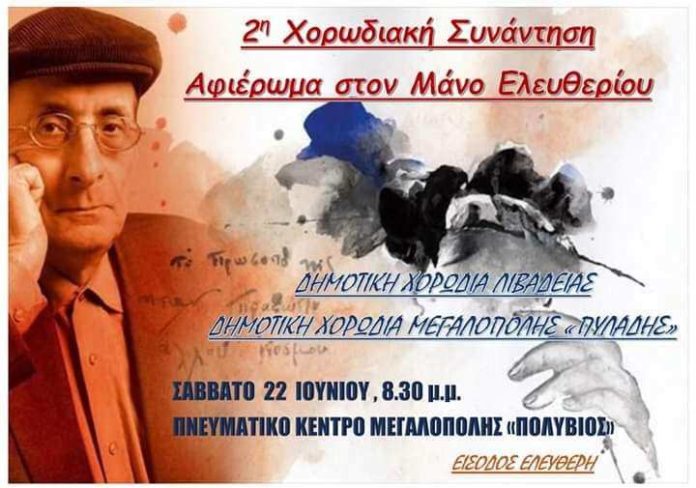 Η  Δημοτική  χορωδία  Μεγαλόπολης  “ΠΥΛΑΔΗΣ” ,  προσκαλεί  όλους  τους συμπολίτες  και  φίλους  της  μουσικής  στην 2η χορωδιακή  συνάντηση που  θα  γίνει  το  Σάββατο 22/6/19  και ώρα  8:30 μ.μ.  στο  Πνευματικό  Κέντρο  “ΠΟΛΥΒΙΟΣ” .