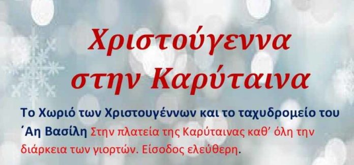 Ο πολιτιστικός σύλλογος «ΚΟΙΝΟΝ ΚΑΡΥΤΙΝΩΝ» στήνει και φέτος στην πλατεία της Καρύταινας το « Χωριό των Χριστουγέννων». Από τις 20 Δεκεμβρίου 2019 και καθ’ όλη τη διάρκεια των γιορτών,επισκέπτες από τόπους κοντινούς ή μακρινούς, θα έχουν τη δυνατότητα να το επισκεφτούν, να φωτογραφηθούν σε αυτό και να απολαύσουν στιγμές ξεγνοιασιάς και πολλές εκπλήξεις!!!