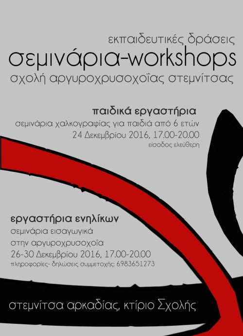 Από 26 έως 30 Δεκεμβρίου θα “τρέχουν” αυτόνομα ημερήσια 3ωρα σεμινάρια ενηλίκων. Τα προγράμματα είναι εισαγωγικά στην Αργυροχρυσοχοΐα και απευθύνονται σε επισκέπτες της περιοχής που θα έχουν την ευκαιρία να βιώσουν την Αργυροχρυσοχοΐα κατασκευάζοντας οι ίδιοι το δικό τους κόσμημα! Για τα παιδιά (άνω των 6 ετών) που τυχόν συνοδεύουν τους συμμετέχοντες στα σεμινάρια, θα πραγματοποιηθούν παράλληλα προγράμματα δημιουργικής απασχόλησης. Τα σεμινάρια πραγματοποιούνται με συμβολικό κόστος για τους συμμετέχοντες.