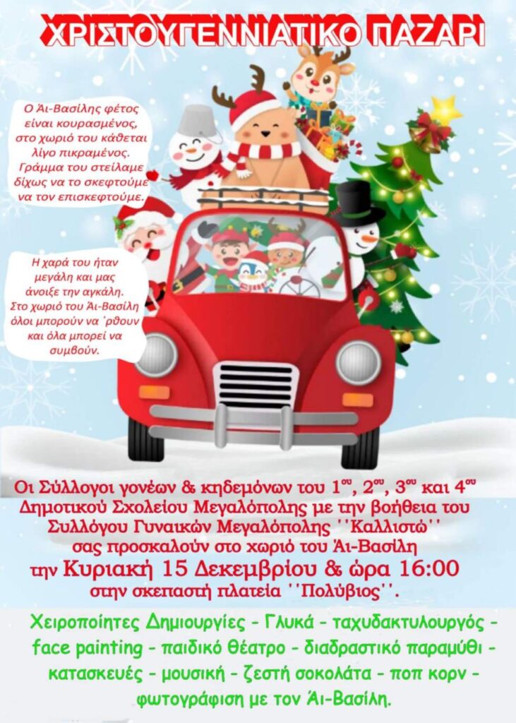 Οι Σύλλογοι Γονέων – Κηδεμόνων των δημοτικών σχολείων Μεγαλόπολης σας προσκαλούν στο χριστουγεννιάτικο παζάρι στις 15 Δεκεμβρίου στην πλατεία Πολυβίου . Η εκδήλωση γίνεται με τη βοήθεια του συλλόγου γυναικών Μεγαλόπολης “Καλλιστώ”.