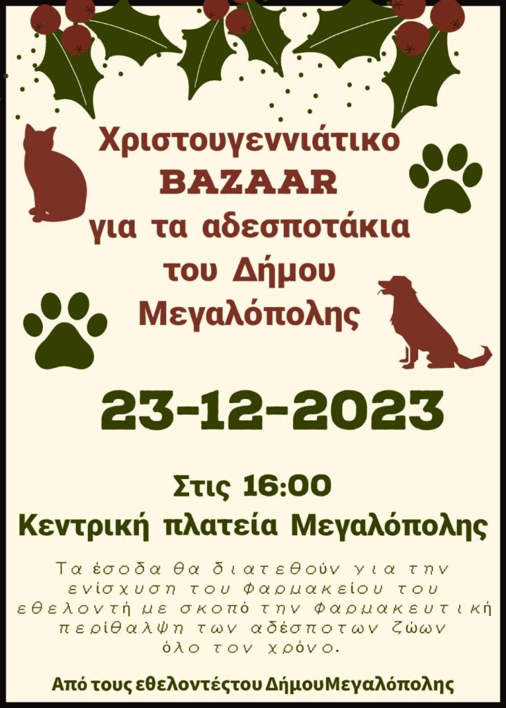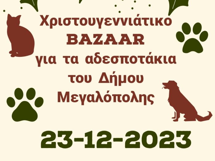 Το Σάββατο 23 Δεκεμβρίου στις 16:00 στην κεντρική πλατεία Μεγαλόπολης διοργανώνεται Χριστουγεννιάτικο Bazaar για τα αδέσποτα του Δήμου Μεγαλόπολης.