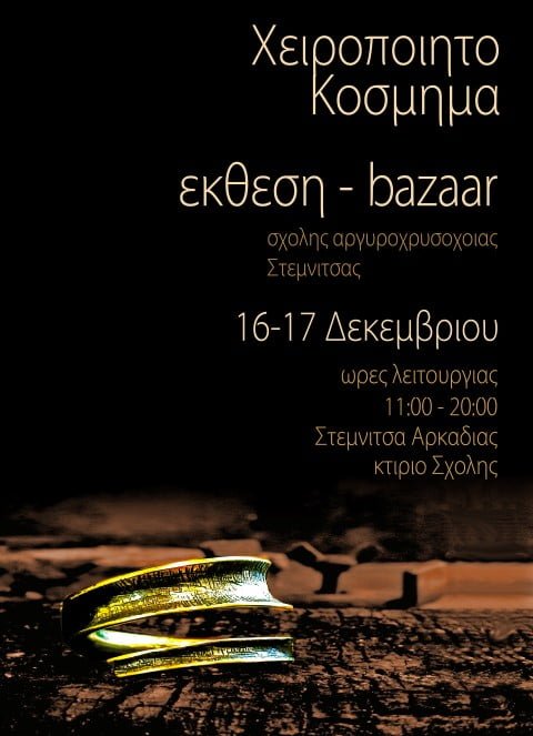 Αυτό το Σαββατοκύριακο 16-17 Δεκεμβρίου 2017, η Σχολή Αργυροχρυσοχοΐας Στεμνίτσας σας προσκαλεί στο Χριστουγεννιάτικο Bazaar της, με κοσμήματα μαθητών, γούρια και δώρα, ενώ ταυτόχρονα θα λειτουργούν και παιδικά εργαστήρια. Η έκθεση θα πραγματοποιηθεί στο κτίριο της Σχολής, στη Στεμνίτσα Αρκαδίας και θα είναι ανοιχτή από τις 11 το πρωί έως τις 8 το βράδυ.