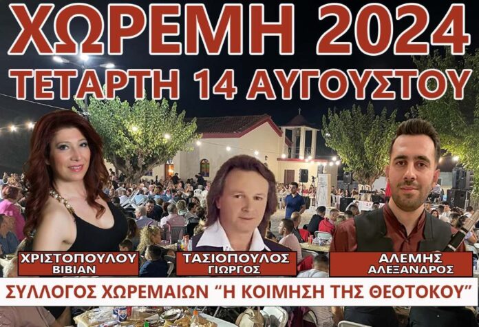 Ο Πολιτιστικός Σύλλογος Χωρεμαίων, «Η Κοίμηση της Θεοτόκου»  διοργανώνει και φέτος το παραδοσιακό πανηγύρι την Τετάρτη 14 Αυγούστου , το βράδυ στην πλατεία του χωριού.