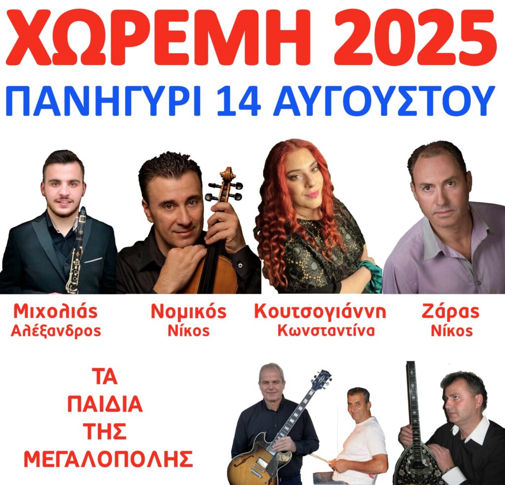 Ο Πολιτιστικός Σύλλογος Χωρεμαίων, «Η Κοίμηση της Θεοτόκου» διοργανώνει και φέτος το παραδοσιακό πανηγύρι την Πέμπτη 14 Αυγούστου , το βράδυ στην πλατεία του χωριού.