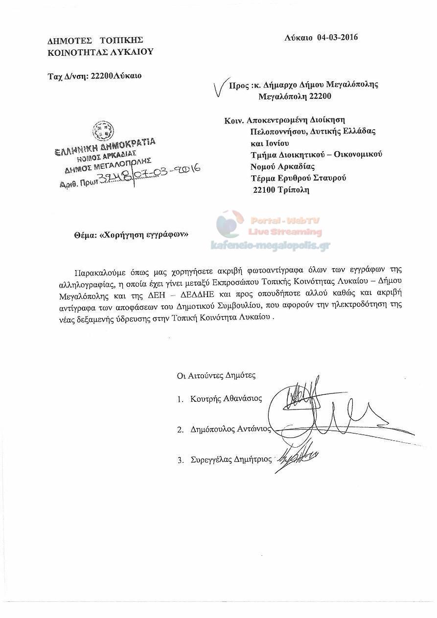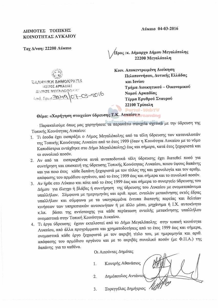 Με 2 νεότερα έγγραφα που στέλνουν στον  Δήμο Μεγαλόπολης και κοινοποιούν στην Αποκεντρωμένη Διοίκηση Πελοποννήσου, 3 κάτοικοι από την Τ.Κ. Λυκαίου Μεγαλόπολης , ζητούν να ενημερωθούν για θέματα που αφορούν την ύδρευση το χωριό.