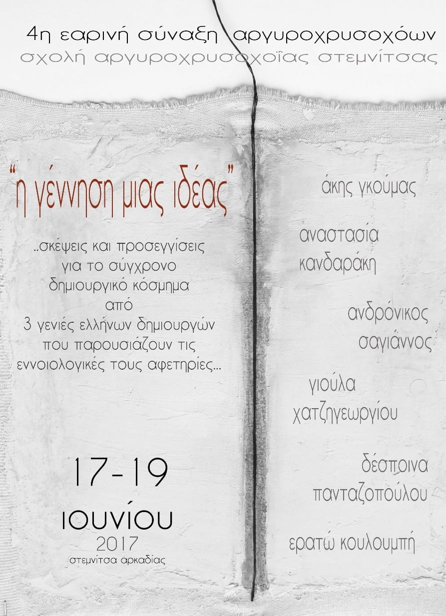 Η Σχολή Αργυροχρυσοχοΐας Στεμνίτσας και η Στέγη Αργυροχρυσοχοΐας Στεμνίτσας παρουσιάζουν την 4η Εαρινή Σύναξη Αργυροχρυσοχόων, που θα γίνει από 17 έως 19 Ιουνίου 2017, στη Στεμνίτσα Αρκαδίας.