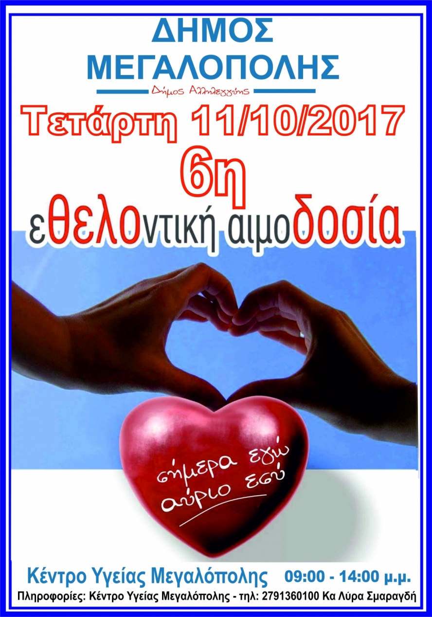 ΑρχικήΑΙΜΟΔΟΣΙΑ6η εθελοντική αιμοδοσία στην Μεγαλόπολη την Τετάρτη 11 Οκτωβρίου