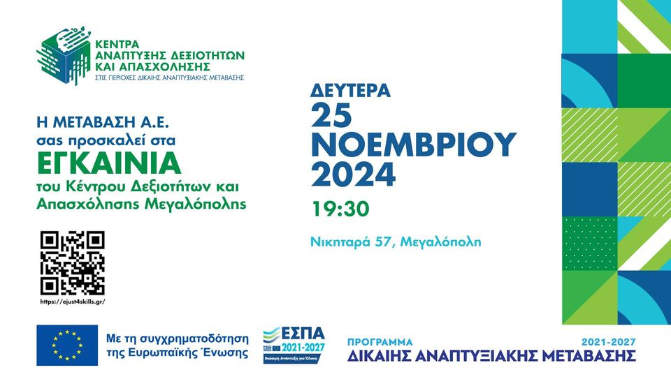 Η ΜΕΤΑΒΑΣΗ Α.Ε. σας προσκαλεί στα εγκαίνια του νέου Κέντρου Δεξιοτήτων και Απασχόλησης στην καρδιά της Μεγαλόπολης, την Δευτέρα, 25 Νοεμβρίου 2024, στις 19:30, στην οδό Νικηταρά 57 (πρώην ΕΦΚΑ).