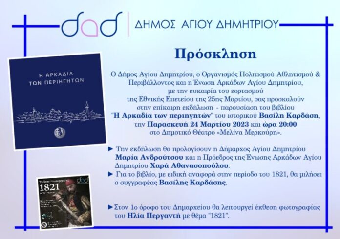 Ο Δήμος Αγίου Δημητρίου, ο Οργανισμός Πολιτισμού Αθλητισμού & Περιβάλλοντος και η Ένωση Αρκάδων Αγίου Δημητρίου, με την ευκαιρία του εορτασμού της Εθνικής Επετείου της 25ης Μαρτίου, σας προσκαλούν στην επίκαιρη εκδήλωση – παρουσίαση του βιβλίου “Η Αρκαδία των περιηγητών” του ιστορικού Βασίλη Καρδάση, την Παρασκευή 24 Μαρτίου 2023 και ώρα 20:00 στο Δημοτικό Θέατρο «Μελίνα Μερκούρη»