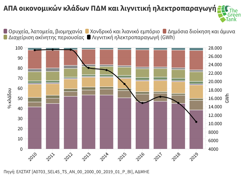 - Παρά τη μείωση της παραγωγής ηλεκτρικής ενέργειας από λιγνίτη τα τελευταία χρόνια, τα τελευταία διαθέσιμα στοιχεία (2019) δείχνουν πως η λιγνιτική δραστηριότητα παραμένει κυρίαρχη στη Δυτική Μακεδονία τόσο σε όρους ακαθάριστης προστιθέμενης αξίας (ΑΠΑ), αντιπροσωπεύοντας το 38% της ΑΠΑ της Περιφέρειας το 2019, όσο σε και αριθμό εργαζομένων που αντιστοιχεί στο 17,4% του συνόλου των εργαζομένων το ίδιο έτος.