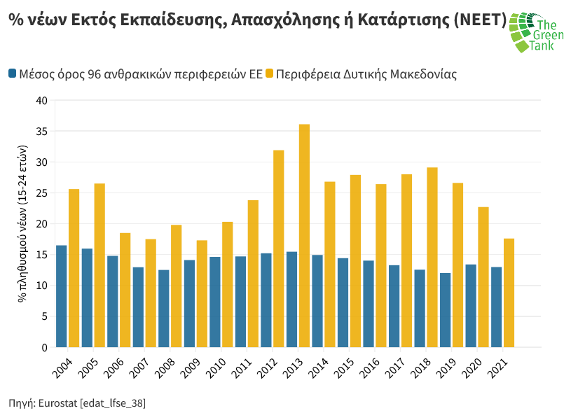 - Tα ποσοστά ανεργίας των νέων ηλικίας 15-29 ετών στη Δυτική Μακεδονία στην πορεία των χρόνων ξεπερνούν κατά πολύ τον μέσο όρο των 96 ανθρακικών περιφερειών της Ευρωπαϊκής Ένωσης με 42% έναντι 13,3% αντίστοιχα το 2021.