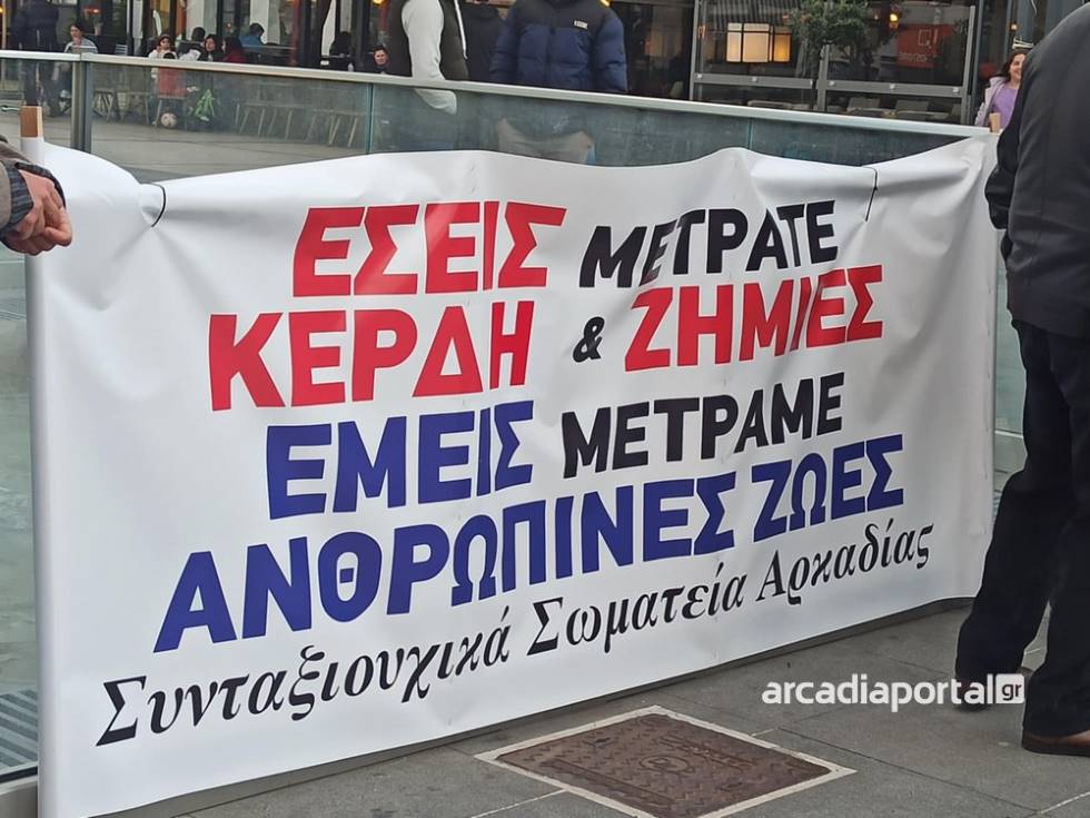 Σε πανό που είχαν ετοιμάσει τα Συνταξιουχικά Σωματεία Αρκαδίας έγραφε «Εσείς μετράτε κέρδη και ζημιές, εμείς μετράμε ανθρώπινες ζωές».